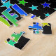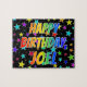 This vibrant, lively, birthday-themed jigsaw puzzle design features the message "HAPPY BIRTHDAY, JOEL" with the characters having a colorful rainbow spectrum inspired gradient pattern, along with a fun stars background pattern. A vibrant puzzle like this might be a fun way to send birthday wishes to somebody named Joel. [~Z0000468]