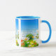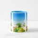 This two-tone mug features a fira code light print font with blue letters yellow outline showcasing the "John 14:2 KJV" bible scripture verse over a background picture displaying a springtime theme with white/yellow flowers plus green stems with a dim view under a beautiful clear blue sky. This verse is referencing the Book Of John 14th chapter showing the 2nd verse in this bible scripture quote theme from the King James bible. The rim & handle are glazed in matching colors available in 11-ounce or 15-ounce sizes microwave and dishwasher safe ceramic construction.