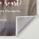 Inspirational Christian scripture tapestry depicts a nature watercolor painting including a marsh with blue water and reeds. It features a portion of an encouraging Bible Verse John 16:33, in the words of Jesus, "In this world you will have trouble. But take heart! I have overcome the world.”