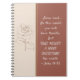 Inspirational scripture notebook, journal depicts an ivory and brown simple modern design with a sketched fine line flower. It features Bible Verse John 16:33, in the words of Jesus, "In this world you will have trouble. But TAKE HEART! I HAVE OVERCOME the world."_
