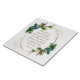 Inspirational scripture Christmas ceramic tile depicts simple watercolor evergreen branches on a gold geometric frame adorned with holly leaves, red berries and gold splashes. It features Bible Verse John 3:16, "For God so Loved the world, that he gave his only Son, that whoever believes in Him should not perish but have eternal life." *