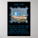 John 3:16 For God so loved the world that he gave his one and only Son, that whoever believes in him shall not perish but have eternal life.On a poster with a old boat in the calm ocean and a light blue frame.Realistic artwork created from oil paintings.