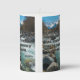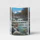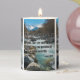 This pillar candle showcases a design that features a Norwester print font with black letters silver colored outline displaying the "John 7:38" KJV bible scripture verse over a picture featuring a flowing river with raging waters with a mountain in the far distance surrounded by trees in the background in this faith based theme. This verse is referencing the Book Of John 7th chapter showing the 38th verse in this bible scripture quote theme from the King James bible. The candle is covered with a beautiful full-color wrap hand poured, individually designed made with high grade American paraffin & beeswax and, burns approximately 40 hours made in the USA.