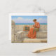Postcard features "Songs Without Words" (1918) painting by John William Godward. This light-colored, beautiful classic artwork features a woman holding a flute on a bench next to a caged bird with an ocean backdrop. Mainly shades of orange, blue, and brown.