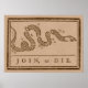 The "Join or Die" print was a political cartoon created by Benjamin Franklin. The snake shown is separated into segments, just as the original colonies were split. The cartoon was used to unite the colonies to fight against the British. Celebrate American History with this digitally restored vintage poster from The War Is Hell Store.