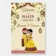 Joint haldi pithi Indian wedding bridal couple in yellow outfits yellow flowers hanging lanterns welcome sign board.