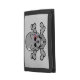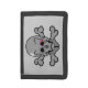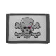 A Skull and cross bones pirate picture. The skull and bones of this design are drawn in shades of grey and black. As a point of difference one eye has pink and yellow inside the socket.