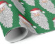 A jolly repeating pattern of Santa with long curly beard over a green background.