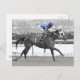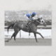 Winter racing at historic Aqueduct Racetrack, home of the prestigious Wood Memorial stakes. Jockey Junior Alvarado is in full control as he powers to the lead with his powerful bay colt Mo Flash. Wearing blue and white polk a dots and silks, the rider is on his way to victory. Photo is in black and white except for the blue color splash on his silks. The rider eases up and stands in the stirrups as he nears the finish line.