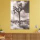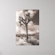 A solitary Joshua tree stands tall against a backdrop of a cloudy sky in a desert landscape. The tree's unique branching structure and spiky leaves are prominent, while the surrounding desert vegetation is visible in the foreground. The image is captured in black and white, creating a sense of stark beauty and emphasizing the textures of the desert environment.