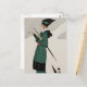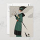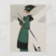 Vintage European fashion from a French woman's magazine. A fashionable woman out for a walk as she notices it's starting to rain.