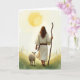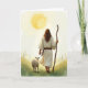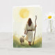 This design shows a person seen from behind with long brown hair, wearing a loose pale tunic tied at the waist with a darker sash, walking through a sunlit field with a steady, caring pace. In one hand, they carry a simple wooden staff, angled slightly forward as if guiding the way. Close at their side, a small woolly animal pads along, its gentle posture and nearness suggesting trust and friendship 🐇. The background glows with a huge amber sun near the upper left, washing the scene in golden light that softens every edge. Tall grasses in muted greens and warm yellows rise from the foreground, leaning as though a light breeze is passing through 🌷. Any wording sits lightly near the top in a warm brown tone, with smaller lines placed beneath in a softer gold so the landscape stays the focus. The figures are framed by blended, watercolor-like shading, and the sun’s halo fades into a pale sky above the grass line.