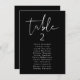 This table number seating chart features an edgy handwritten font and modern minimalist design with an edgy black and white color combination. Easily change the number and the names along with all of the colors to fully match your event.