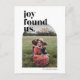 Simple and minimalist with a modern twist, this single photo holiday postcard send a budget friendly message of hope with the sentiment that "joy found us" despite life's challenges. Clean black and white keep the theme simple to showcase a great family photograph while easy to customize backer text lets you send a longer message to friends and family. Personalize the design further by changing the black and white elements to a color of your choice.