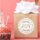 Christmas gift label sticker with your personal message and names in gold stylish typography features the text JOY in handwritten typography with a stylish touch of rustic foliage. Simply add your personalized holiday wishes text. Exclusively designed for you by Happy Dolphin Studio. If you need any help or matching products please contact us via our store chat. Happy holidays and Merry Christmas!