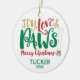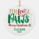 This Christmas ornament features the expression "Joy Love & PAWS" in whimsical red, green and gold typography with cute little paw prints and a bone! Perfect for dog lovers! Contact us if you would like this design applied to a specific product to create a matching item. Thank you so much for viewing a DoodleLulu by 2 june bugs design!