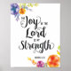 Modern calligraphy typography design with black words, "The Joy of the Lord is my Strength." Design has colorful watercolor hand-painted flowers border in upper left and lower right corners.