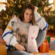 Christmas pillow. Joy with watercolor poinsettia and greenery. Personalize with your details and holiday family photo.