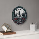 This striking clock features a silhouette of Santa's sleigh and reindeer flying over a forest of dark pine trees, set against a large white moon and a green and blue plaid sky. The bottom half is richly decorated with detailed holly, berries, and pine boughs, centered around the ornate white script word "Joy." The design provides a sophisticated, stylized Christmas look. The design may look real due to the high detail and three-dimensional texture in the artwork.