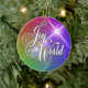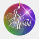 Multi-colored background with Joy to the world in fancy cursive script., blazing white star to the right. blues greens purple and red background. back has "the Lord hath Come" in the same cursive script.
