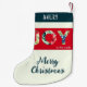 A stylish stocking with 'Joy to the world' words in the center, with the word 'Joy' infilled with a botanical green leaf and red poinsettia flower design. Below this is the greeting 'Merry Christmas' in festive script typography. The stocking can be personalized with a name on the green panel at the top.