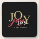 A festive holiday bar coaster for the Christmas season, this Joy to the World typography design has the word joy spelled out in three different colors using different font styles and colors to create a modern spin on a classic Christmas carol. The black background adds a sophisticated modern look for this unique item for your holiday entertaining and quiet times as well.