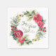 Inspirational quote Christmas napkin depicts an elegant watercolor wreath with red and pink flowers, green leaves, and evergreens on a white background. It features the beloved Christmas carol, "Joy to the world, the Lord is come."
