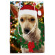 A digital art painting of a young pup ready for Christmas with a wreath, Santa hat and a decorated tree.