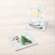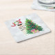 Paper coasters with a funny illustration. A cute llama wearing black sunglasses and a red santa hat. Standing behind a Christmas tree with festive presents. The word Joy written above his head in a colorful holiday font. Silver bokeh background. Whimsical and fun Christmas themed design.