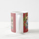 This Christmas mug features trendy watercolor painted Christmas leaves and pine branches accented with red berries. Two photo frames allow you to add your favorite family photos. The background is a rich dark red and is accented with white calligraphy hand lettered style text that reads: Joy. The design offers custom text for your family name and year. This is a perfect keepsake gift for this Christmas. Photography © Storytree Studios, Stanford, CA