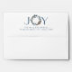 Beautiful holiday envelope in white with your return address information on back top flap in blue, showcased by the word "JOY" with letters "J" and "Y" in attractive decorative swirl paper in blue and silver, while letter "O" made of delicate watercolor holiday wreath in blue, silver, and cream tones. Inside with decorative swirl pattern in blue and gray silver tones. Collection with coordinating products available.
