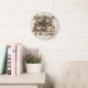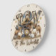 This beautiful, rustic clock depicts a traditional Nativity scene with Mary, Joseph, and the Baby Jesus in a humble stable, surrounded by a camel, sheep, and other animals. The word "JOY" is prominently displayed above the stable in a distressed, patterned font, with "To The World" scripted below, all set against a light wood grain background. The design may look real due to the high detail and three-dimensional texture in the artwork.