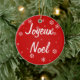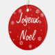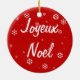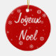 An ornament with a red background, white snowflakes and Joyeux Noel.