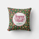 This fabulous Christmas folk art 16" x 16" green pillow with a pattern of santas, gingerbread men, Christmas trees, ornaments, angels and presents that says Merry Christmas in French "Joyeux Noel" and has your last name would look awesome on your couch, bed or chairs! It's so festive and will go with any Christmas decor - it's rustic yet retro and modern yet traditional! It'll look fantastic and add that little extra Christmas touch to your home!