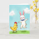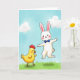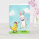 This design shows a fluffy white bunny-like character with long ears and rosy cheeks springing upward as if showing off for a close friend 🐰. A small round yellow chick-like bird stands to the left, watching with a fond, amused look that suggests an easy bond between them. The bunny wears a bright blue bow tie, and a soft shadow beneath it hints at the jump above the green hill. The bird has a red comb and wattle, adding a warm accent against its sunny yellow body. Behind them, a pastel blue sky stretches across the scene with rounded white clouds floating overhead 🌷. There is no text in the artwork, leaving open space in the sky where a greeting could sit near the top in a gentle color like light pink or soft gray. The hill slopes slightly upward, with smooth green shading that frames the two characters near the center.
