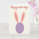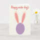 This card features a simple bunny-like figure centered on a soft cream background 🐰. A smooth lavender circle forms the body, and two tall upright ears rise from the top in pale pink with a deeper rose accent, giving it a gentle, affectionate look. The rounded shapes and calm spacing make the scene feel like a quiet spring hello shared between friends. Near the top, a short Easter greeting sits above the character in flowing red lettering, standing out clearly against the light backdrop 🌷. The text is placed with plenty of breathing room, keeping the focus on the little figure below. The pastel palette of cream, lavender, and pink keeps everything soft and tender, like a warm glance held a moment longer. Fine color layering inside each ear suggests an inner-and-outer ear detail, adding depth without adding clutter. The ears show a pale pink outer area with a darker rose inner stripe, set above the lavender circle on the cream field.