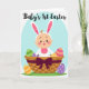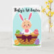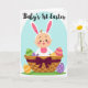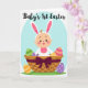 Designed with a sweet spring scene, this card features a smiling infant with peach-toned skin and rosy cheeks, dressed in a white bunny outfit with tall ears lined in pink 🐰. A small orange sprout sits on top of the head, adding a cute accent that makes the character look like it’s ready for a gentle cuddle. The baby rests snugly inside a sturdy woven basket with a checkered texture, tied with a deep plum bow that feels like a thoughtful gift from a close friend. Behind the basket, a soft cerulean oval frames the scene like a tender backdrop, set against a bright white field. Along the top edge, a short greeting appears in thin, flowing lettering in a dark tone, centered above the character. A green strip beneath the basket suggests fresh grass, while patterned eggs in green stripes, purple dots, and tangerine bands are scattered in and around the basket 🐇. The final detail is the rich plum bow draped across the basket’s front, with the egg shapes peeking out beside it.