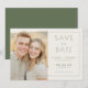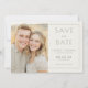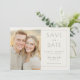 This wedding save the date card features a split layout with a soft, natural photo on one side and clean, modern text on the other. The color palette includes neutral tones like beige and cream, creating an elegant and minimalist aesthetic. The typography is crisp and sans-serif, emphasizing clarity and sophistication, while the overall design conveys joy and anticipation for the upcoming celebration. Perfect for couples looking to announce their wedding in style, this card sets the tone for a memorable event.