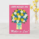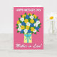 Designed with a bright hot pink background, this card centers on a symmetrical bouquet that feels like a cheerful gift offered with real affection ❤️. The flowers are simplified and tightly clustered in sunny yellow, calm blue, and white, each with a tiny dark or red center that adds a gentle sparkle. Deep green leaves with broad veins spread between the blooms, giving the arrangement a full, caring look, like it was gathered with someone special in mind. The bouquet sits in a pale yellow container shaped like a wrapped present, tied with a cyan-blue ribbon and a neat bow that hints at a warm, close relationship. Curved white text at the top reads “HAPPY MOTHER’S DAY,” standing out clearly against the pink with a subtle shadow. A second curved line of white text at the bottom reads “Mother in Law!” and balances the design with a friendly, inclusive tone 🌼. The bow is centered on the container, with the ribbon tails angled slightly outward beneath the bouquet.