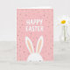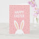 Designed with a tall, vertical layout, the card shows a blush pink background sprinkled with small black dots like light confetti. Centered near the top is a large, all-caps seasonal greeting in thick, rounded creamy white letters, spaced evenly so it feels open and friendly. The simple contrast between the pale background and the dark dots gives the message room to stand out without feeling busy. Along the bottom edge, a shy bunny 🐰 peeks up into view, showing only the top of its head and two long upright ears. The ears are bright white with soft peach inner details, and their gentle tilt suggests a tender, bashful hello, like a quiet nudge of friendship. The limited palette of pink, white, peach, and black keeps the scene calm and sweet, with a light spring touch 🌷. The bunny’s ears rise from the lower border just beneath the centered greeting, framed by scattered black dots across the pink field.