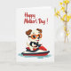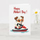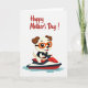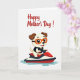 This card shows a light-furred, human-like puppy with warm brown ears and a wide, friendly grin, bringing a sweet, affectionate energy to the scene ❤️. The character sits in the lower middle of the design, leaning forward as if eager to share the ride with someone close. Big dark eyes look out from behind bright orange swim goggles, and a simple dark life vest adds a sporty, safe-at-heart touch. The puppy steers a sleek personal watercraft colored red and white with deep blue-black accents, angled to suggest motion and excitement. Light blue water ripples splash outward beneath it, keeping the setting minimal while still feeling like a sunny day on the water 🌼. Near the top, the words “Happy Mother’s Day!” appear in flowing red lettering, centered and easy to spot against the white background. The open white space around the illustration makes the red text and the cheerful character stand out clearly. The watercraft’s red nose points slightly up and to the right, with pale blue ripples trailing behind it.