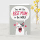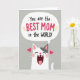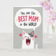 This design shows a cheerful cartoon cat shown from the neck up, mostly white with a gray patch on one ear, tilting its head back as if laughing with someone it adores ❤️. Its eyes are closed in delight, with rosy cheeks, thin white whiskers, and an open mouth showing a pink tongue and simple teeth. Two red hearts hover near its head, adding a cozy, affectionate tone like a warm hug between close family. A large white speech bubble fills the upper part of the card and points toward the cat, making the message feel like it’s being spoken out loud. Inside the bubble, the text reads “You are the BEST MOM in the WORLD!” with “BEST MOM” in deep pink-red and the rest in rounded black letters. Short yellow rays fan out around “BEST MOM,” like little sunbursts 🌼 that draw your eyes to the center words. The background stays a flat, soft gray so the bright white character and speech bubble stand out clearly. The speech bubble sits across the top two-thirds, with the cat tucked below it and the two hearts floating off to one side.