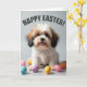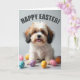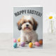 This greeting card shows a small, fluffy bunny centered in the scene, looking straight out with wide dark eyes that seem to linger like a friendly hello 🐰. A tiny pink tongue peeks from its slightly open mouth, giving it a sweet, affectionate look, as if it’s posing for someone it adores. Its fur mixes soft white with warm caramel patches and darker shading near the ears, adding a cozy, tousled texture. Around the bunny, several pastel egg-shaped decorations are scattered across a pale gray background, creating a gentle Easter setting 🌷. The eggs feature stripes and curling patterns in soft blue, sunny yellow, light lavender, and rosy pink, arranged as if they were placed with care for a shared celebration. Near the top, a seasonal greeting sits in bold gray lettering, arched above the bunny and centered over the display. Tiny heart-shaped confetti rests near the eggs, with a few small pieces sprinkled close to the bunny’s paws.