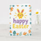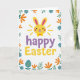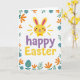 Designed with a bright white background, this card centers on a sunny yellow bunny head with long ears tipped in pink, a small smile, and rosy cheeks 🐰. A tiny yellow bow tie sits under its chin, giving it a sweet, friendly look like it’s leaning in for a gentle hello. Short golden rays fan out around the bunny, adding a cozy glow that feels like a warm spring morning shared with someone close. Just below the illustration, the words “happy Easter” are placed in rounded lettering, with “happy” in soft lavender and “Easter” in matching yellow. A curving border of simple flowers and leaves frames the scene, mixing blue blooms with orange centers, orange petal shapes, and light green foliage 🌷. Near the bottom of the frame, a muted teal egg shape rests quietly, dotted with small yellow polka dots.