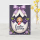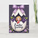 Designed with a large cream-colored egg cracked open at the center, this illustration reveals a cozy spring scene inside. A wide lavender ribbon sits on top in a glossy bow, like a gift wrapping a sweet surprise. Peeking out from the opening is a light-haired child with rosy cheeks and golden curls, looking outward with bright eyes that feel like a friendly hello. On either side of the child, two clusters of deep purple round shapes rest among green leaves, adding a rich contrast against the pale shell. The background is a dark violet field scattered with tiny purple blossoms and a few drifting petals 🌷. Across the lower part of the egg, the words “Easter greetings” appear in a flowing dark style, centered and easy to spot 🐰. Small sprigs of purple flowers dot the corners while loose petals float near the edges of the scene.