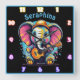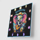 A vibrant elephant wearing a hat strums a guitar, surrounded by playful, colorful patterns that evoke a festive atmosphere, capturing the essence of whimsy and creativity.