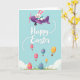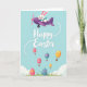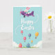 This design shows a light blue spring sky where a cheerful long-eared bunny in a bright blue scarf pilots a sleek purple propeller plane 🐰. A dotted white trail curves behind the plane, guiding your eye toward a large seasonal greeting set near the upper middle in white lettering. Beneath the words, egg-shaped hot air balloons float upward, their soft pink, sunny yellow, and gentle teal colors giving the scene a friendly, affectionate tone, like a shared adventure. Several balloons carry small heart and star decorations, and their tiny brown baskets hang neatly below as if ready to deliver little surprises. Near the bottom edge, tall green grass frames larger decorated eggs that mirror the balloon patterns, adding a cozy, down-to-earth touch 🌷. A few pale, rounded clouds sit off to the side, keeping the background airy without distracting from the main message. The bunny’s plane sits near the top of the card while the balloons rise through the center, with the green grass forming a grounded border along the base. The purple plane, white dotted trail, and pastel balloons stand out crisply against the open blue sky.