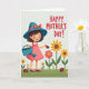 Designed with a bright, storybook-style illustration, this card centers on a young figure standing slightly left of center with a wide smile and shining eyes, dressed in a coral-pink apron dress and a teal wide-brim hat tied with a red bow. They hold a matching teal watering can in one hand while gently presenting a small red spotted insect in the other, as if sharing a tiny secret with someone close ❤️. A soft, even light washes over a grassy garden scene, making the greens feel fresh and the colors feel sunny. Across the lawn, stylized yellow and red flowers bloom with little smiling faces, echoing the figure’s cheerful expression and adding a friendly, affectionate energy. Two more red spotted insects appear in the foreground, spaced apart as if they’ve just wandered into view. In the upper right corner, a short message sits in strong red lettering, standing out clearly against the pale sky. The background stays simple with rolling green grass, scattered blossoms, and the teal hat’s red bow as a crisp accent 🌼.