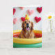 This card shows a happy Golden Retriever sitting front and center in a small inflatable pool, looking straight at you with a friendly, affectionate grin 🥰. Its golden fur catches a gentle light, and its pink tongue hangs out as if it’s mid-laugh, giving the scene a warm, companionable energy. A bright yellow rubber duck is balanced on top of its head, adding a silly touch that feels like a shared inside joke ❤️. The pool’s rings circle around the dog in emerald green, sunny yellow, and fiery orange, making the colors pop against its tawny coat. Behind the dog, the background fades softly into plush heart shapes in pink and deep red, like a cozy Valentine’s backdrop. The greeting text sits near the top in white lettering, standing out clearly against the rosy heart-filled background. Smaller text appears near the bottom in a light pink tone, tucked just above the pool’s rim.
