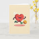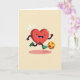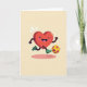 This card shows a glossy red heart character mid-kick, leaning forward with tiny dark arms and legs that make it look like it’s dancing across the page. Its big wide eyes, open smile, and rosy cheeks suggest it’s showing off for someone special 🥰. A magenta-and-gold hexagon-pattern football sits near its foot, adding a fun sporty twist that still reads as affectionate. The heart wears emerald-green shoes, and the bright red body stands out against a pale yellow background that feels like soft daylight. There’s no main message text across the front, leaving the illustration to do the talking ❤️. Small white sparkle marks float above the heart to underline the motion and excitement. A long, soft pink shadow stretches beneath the character, anchoring it on the warm yellow backdrop.